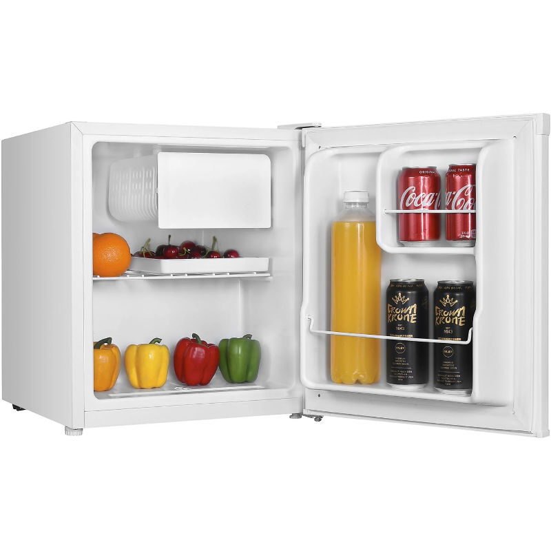 Este es un pequeño frigorífico blanco que cabe en casi cualquier sitio. Guarda lo esencial: bebidas, frutas, lácteos o snacks. No hace mucho ruido, gasta poca electricidad y puedes poner la puerta del lado que prefieras. Es perfecto si vives solo, trabajas en una oficina o necesitas un segundo refrigerador.